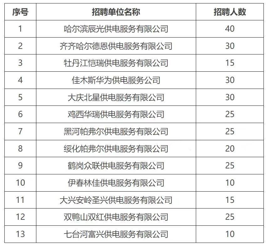 為進一步提高鄉(xiāng)村供電服務(wù)水平,結(jié)合供電服務(wù)公司發(fā)展需求,充實基層供電服務(wù)力量,黑龍江省各地供電服務(wù)公司組織開展2024年供電服務(wù)職工招聘工作,現(xiàn)將有關(guān)事項公告如下: